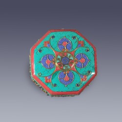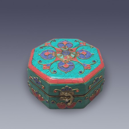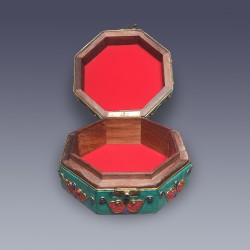 This is a handmade octagonal wooden decorative jewellery box inlaid with Lapis, Malachite and Turquoise gemstone along with different exquisite patterns and Om Mane Padme Hum at the middle. This can be used to store your valuable pieces of jewellery inside this exquisite box that will enhance the value of the jewellery and provides the respect it deserves.